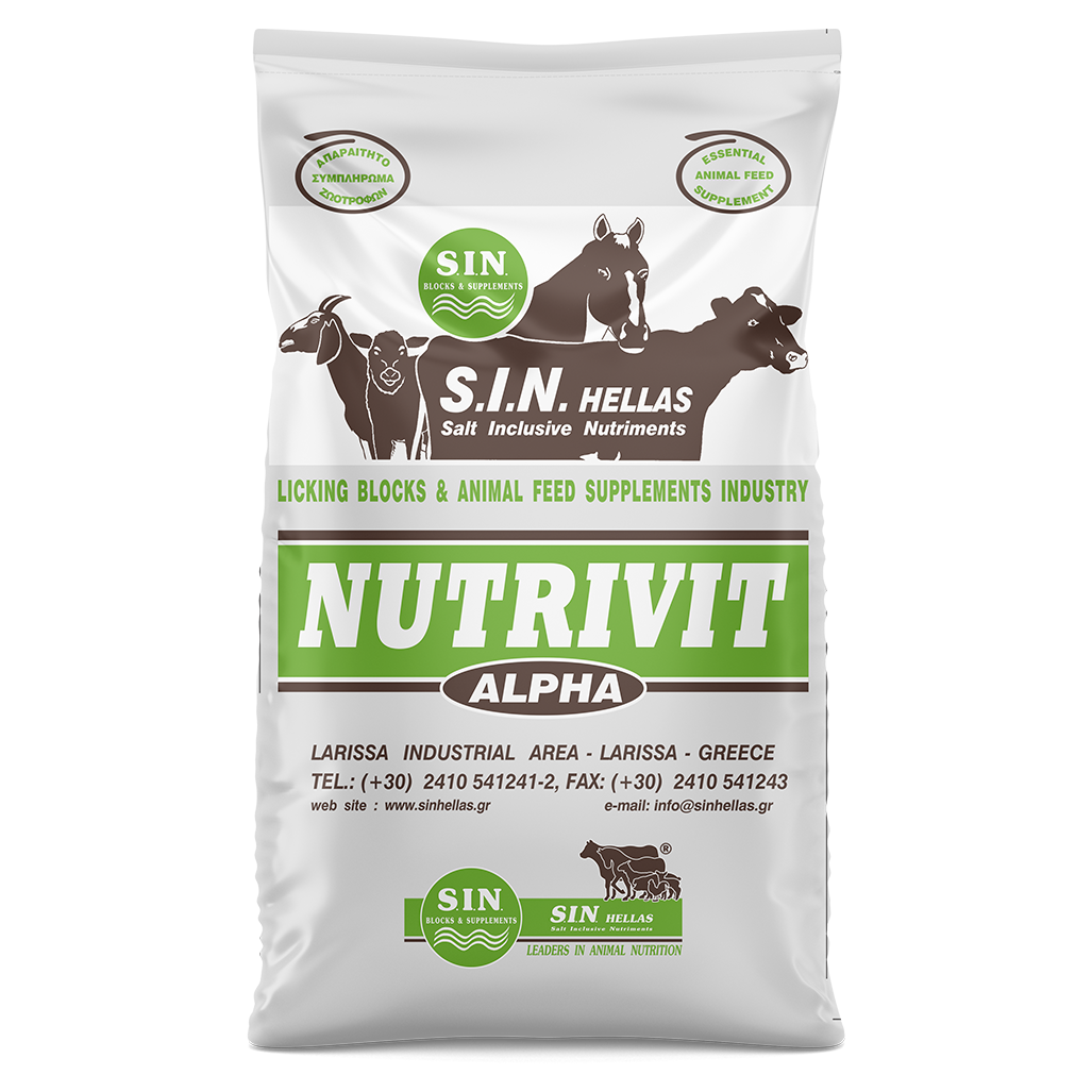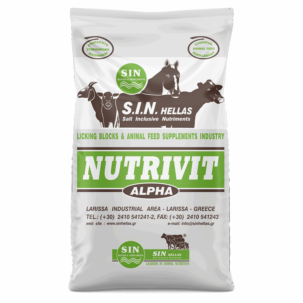 NUTRIVIT ALPHA είναι ένα υψηλής ποιότητας προμίγμα που έχει σχεδιαστεί για να εμπλουτίζει την καθημερινή διατροφή των ζώων με απαραίτητα μέταλλα όπως Φώσφορο, Μαγνήσιο, Ασβέστιο και Νάτριο, καθώς και ιχνοστοιχεία και βιταμίνες. Η ισορροπημένη του σύνθεση ενισχύει την απορρόφηση θρεπτικών συστατικών, τη βελτιωμένη αξιοποίηση της τροφής και την αυξημένη γαλακτοπαραγωγή.