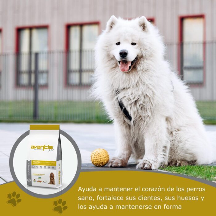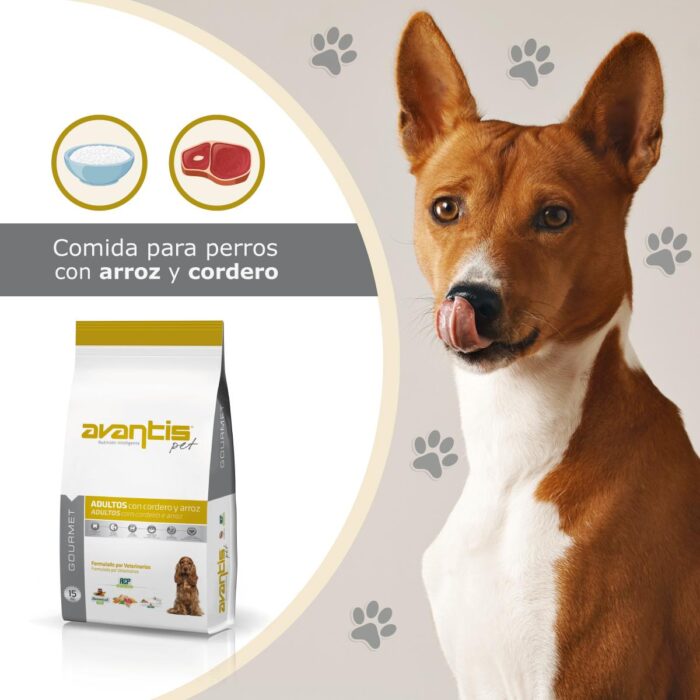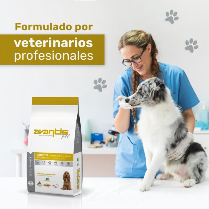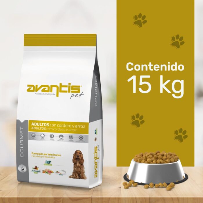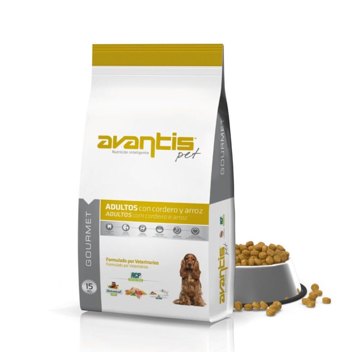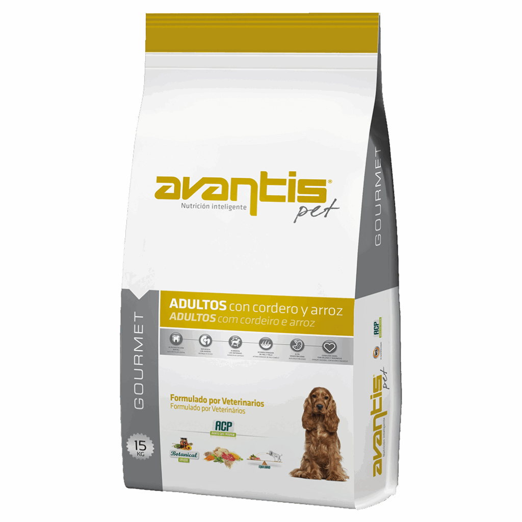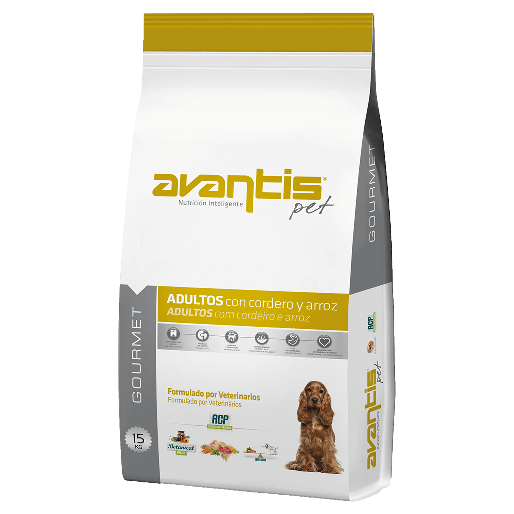 Avantis Gourmet es 100% completo y equilibrado para perros adultos de razas medianas y grandes. Es una fórmula altamente digestible con el delicioso sabor del cordero. Ofrece una triple acción que fortalece el sistema inmunológico, facilita la digestión y proporciona propiedades antioxidantes. También ayuda a los perros a mantener un corazón saludable, ofrece protección dental, fortalece los dientes y los huesos, y les ayuda a mantenerse en forma. Además, incorpora ingredientes botánicos y medicinales como caléndula, tomillo y rosa canina, para reforzar la inmunidad de nuestra mascota contra posibles enfermedades.
