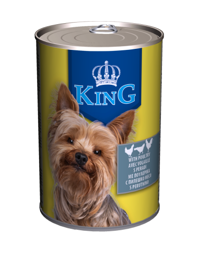 E disponueshme në kanaçe 415g për shokë më të vegjël dhe kanaçe gjigante 1240g për racat më të mëdha, KING siguron që çdo vakt të jetë një festë mbretërore. Jepini qenit tuaj mbështetje për tretje, shëndet të kyçeve, dhe shije të parezistueshme që ai të mbetet i lumtur, aktiv dhe i fortë.