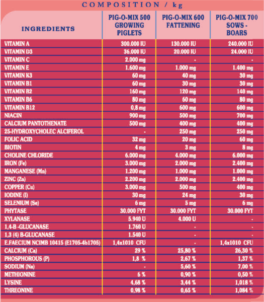 Prasad (PIG-O-MIX 500): Brzi rast, razvoj imunog sistema i sazrevanje creva zahtevaju visoku koncentraciju vitamina (A, D₃, E, B-kompleks), minerala (Ca, P, Na, Zn, Fe, Cu, Mn) i amino kiselina (lizin, metionin, treonin).
